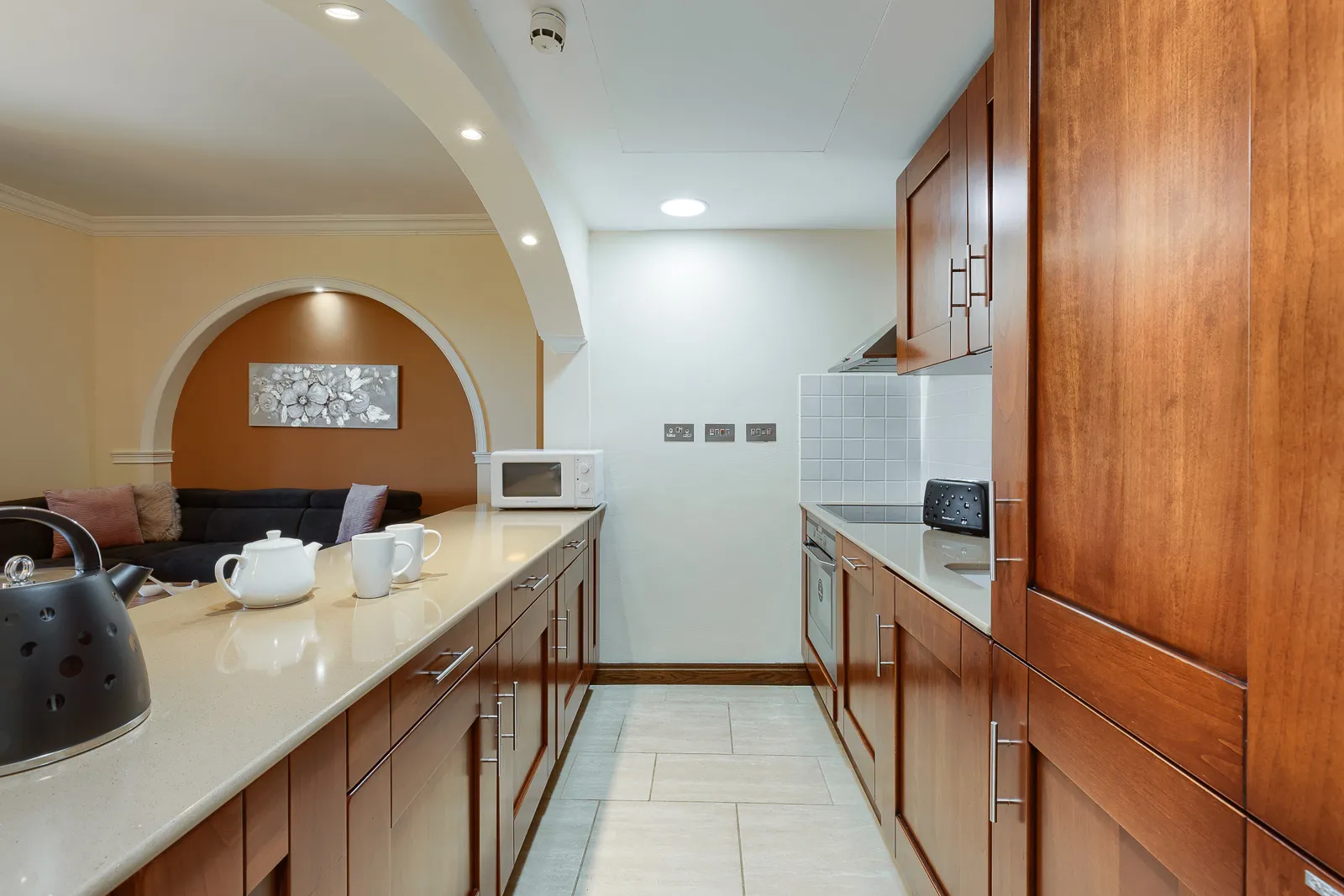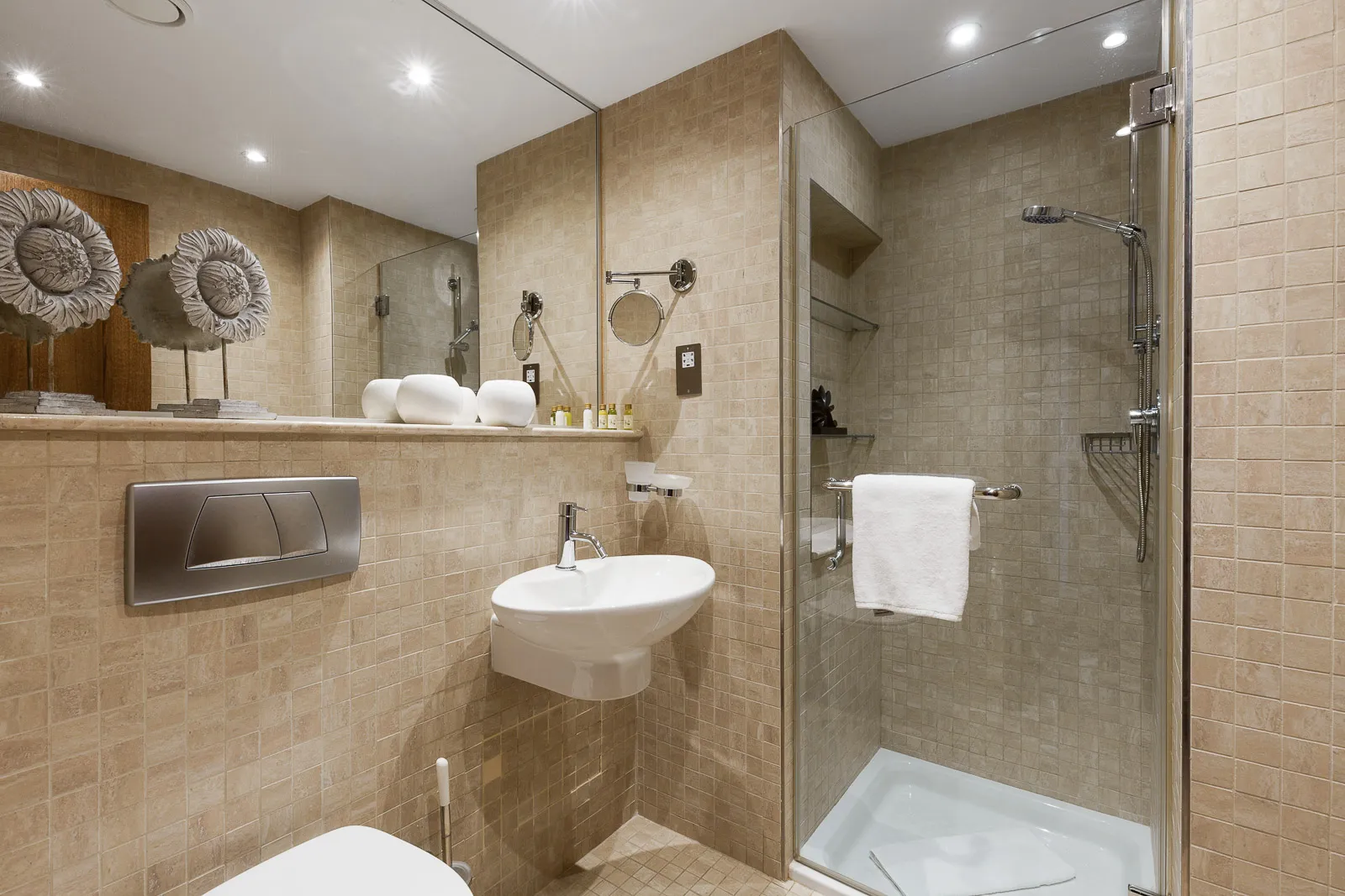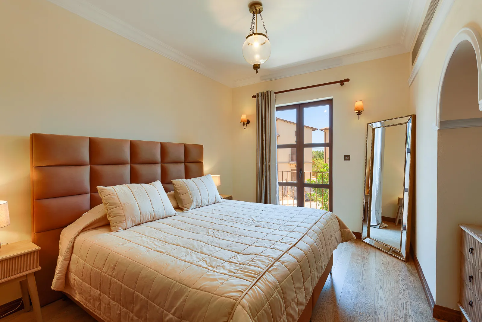A short hallway leads to a guest cloakroom. This is followed in turn by the attractive bedroom which is beautifully furnished with quality furnishings and fixtures including parquet flooring, fitted wardrobes, a large double bed (zip lock) (which offers ziplock to become two singles), bedside tables with lamps and French doors leading out to a small balcony.